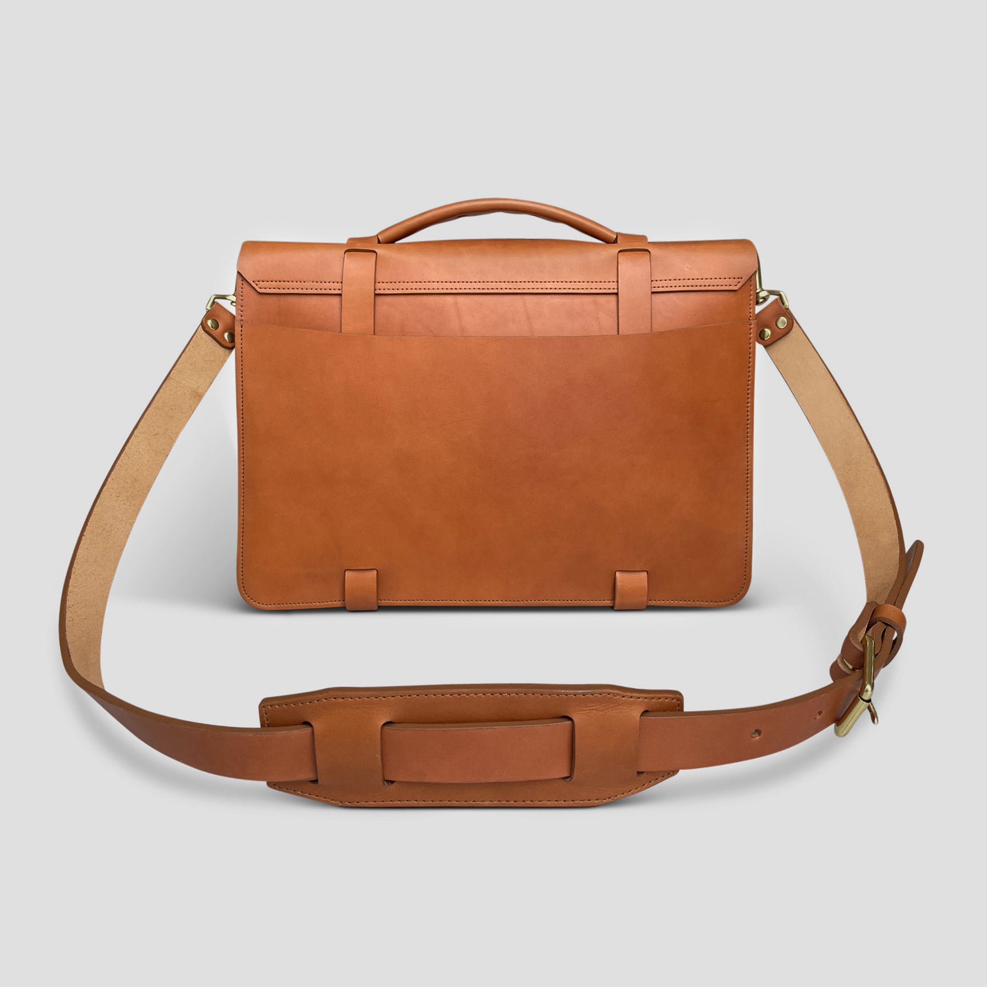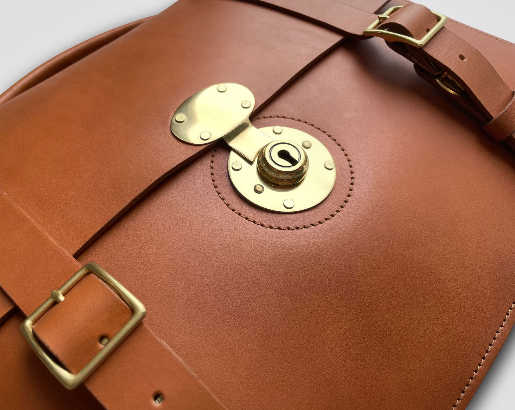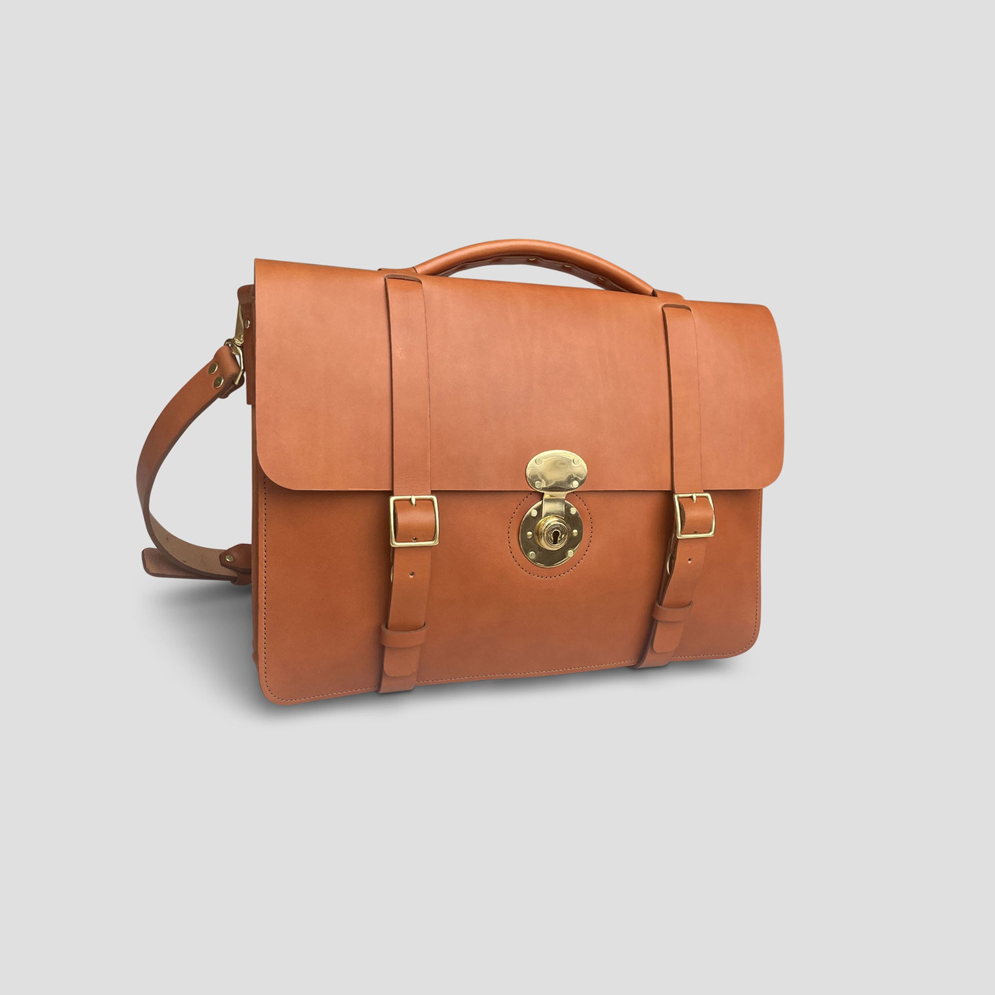 Upgrade your professional wardrobe with our sleek and stylish English briefcase. Handmade with high-quality American-tanned English Bridle leather, it features a traditional round key-lock closure as well as a spacious two-compartment interior. Made in our New England Studio, this improved version includes wrap-around straps and a durable custom key lock, making it a talk-worthy addition to any office.