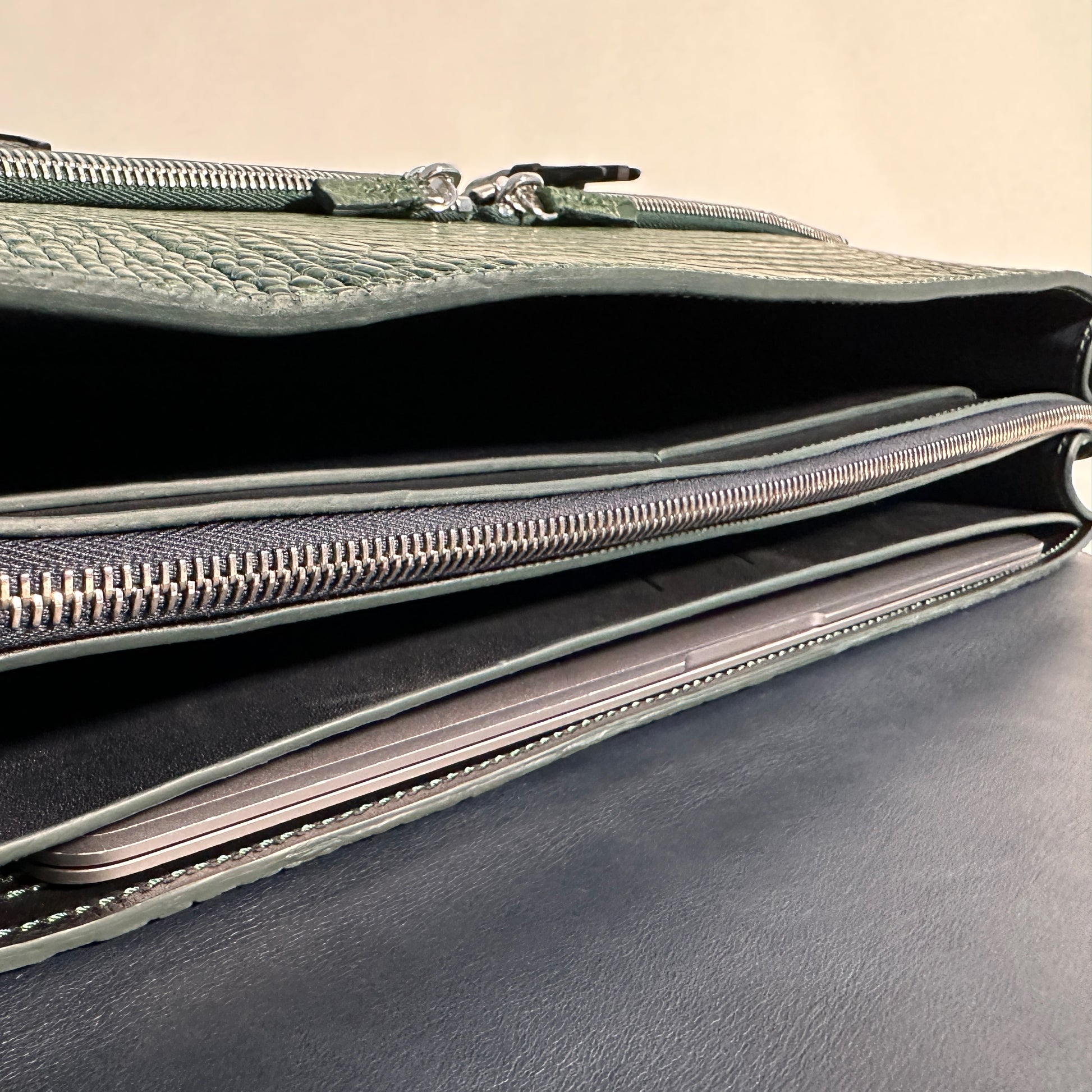 The interior is fully lined in smooth vegetable-tanned English bridle leather, offering structure, durability, and a quiet sense of luxury. A spacious, divided layout with multiple zippered compartments and wide openings ensures effortless organization without compromising the bag’s streamlined form.