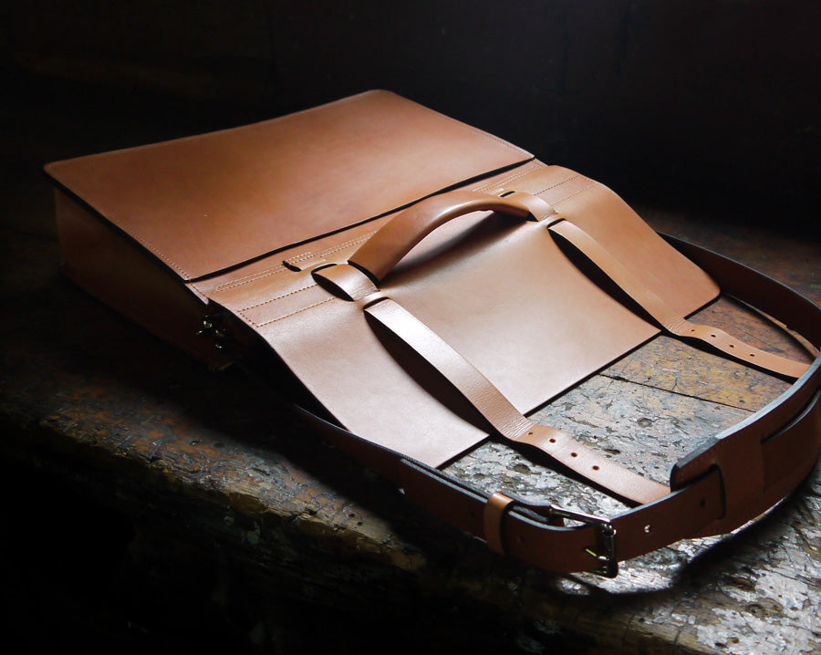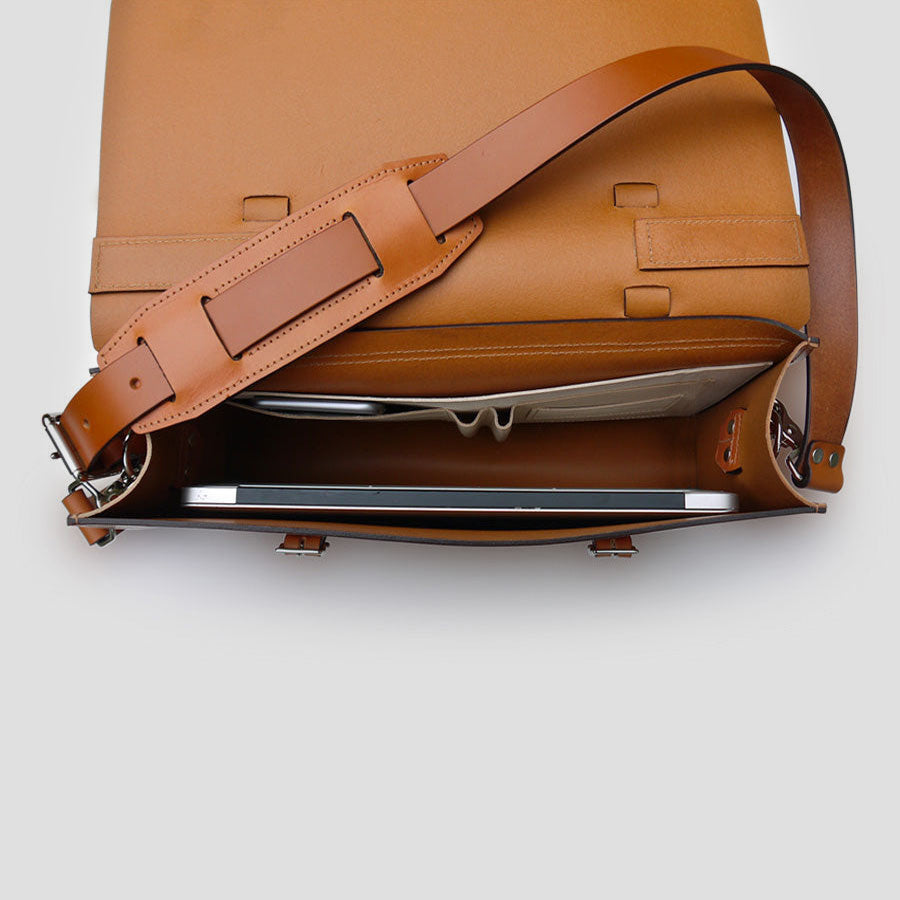 Our essential messenger with a single large compartment is a classic briefcase with a modern feel. With minimal and simplified lines throughout, the bag gives a contemporary style that will yet remain timeless. Crafted from Wickett and Craig full grain vegetable tanned leather, this bag is extremely well-made and guaranteed to last a lifetime with minimal care. Intended for everyday wear, the durable leather will not lose its shape over time. Truly, a lifetime investment to accompany you on all of life’s travels and create the perfect compliment to any discerning wardrobe.