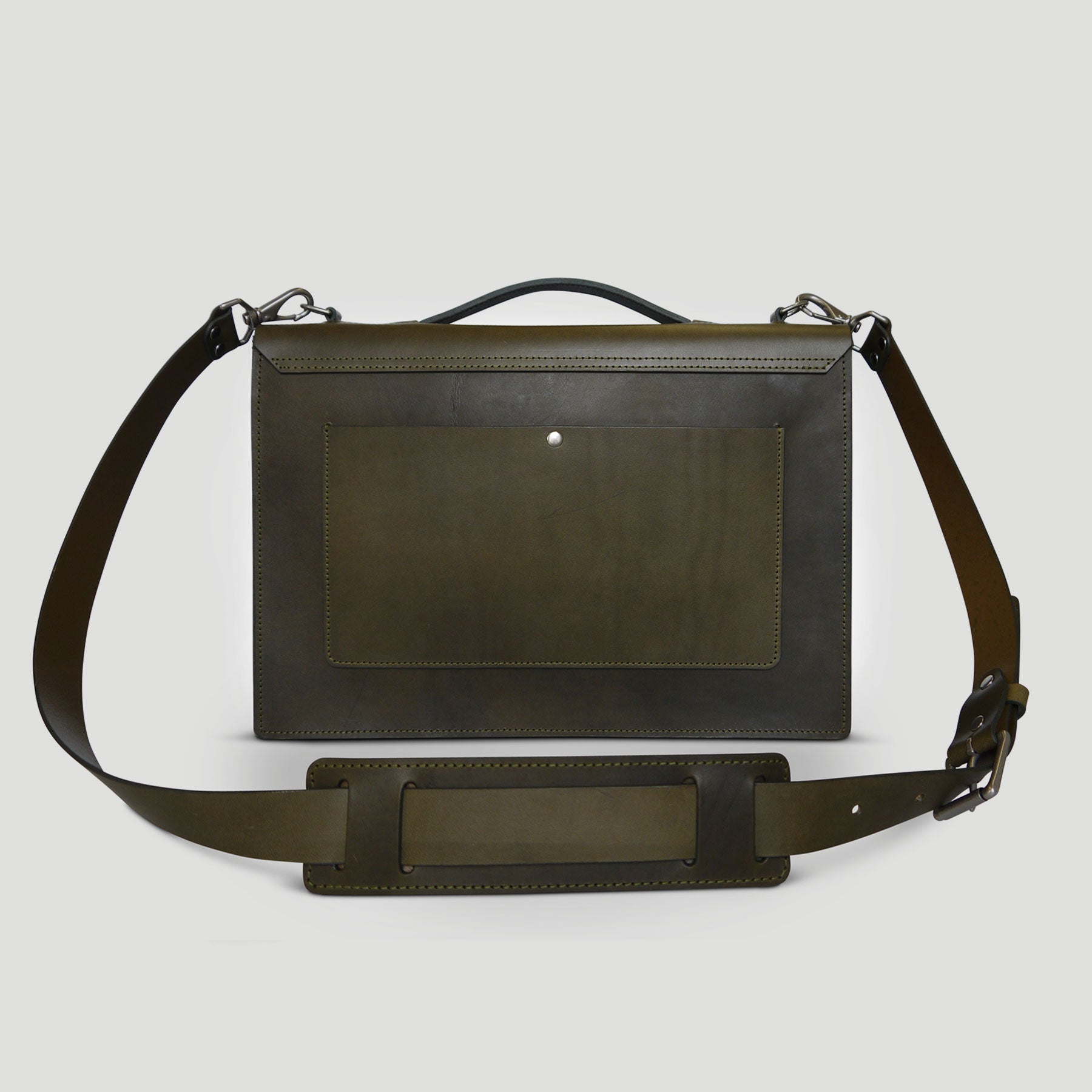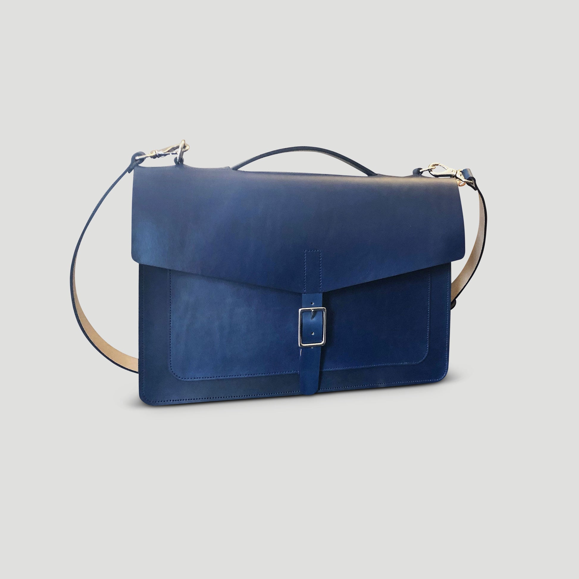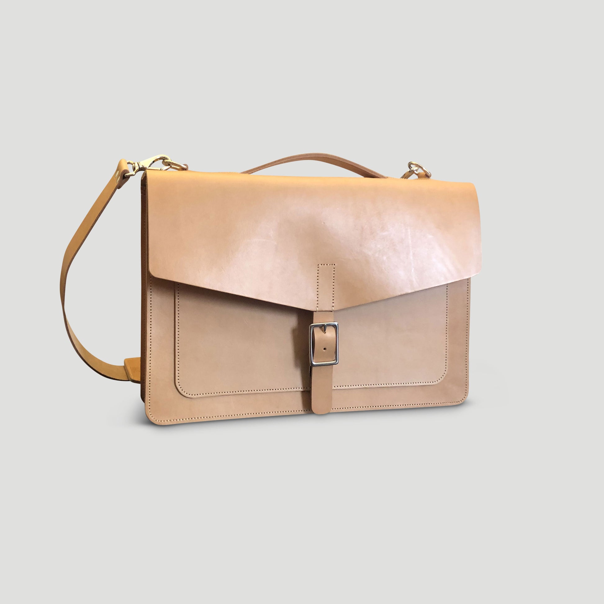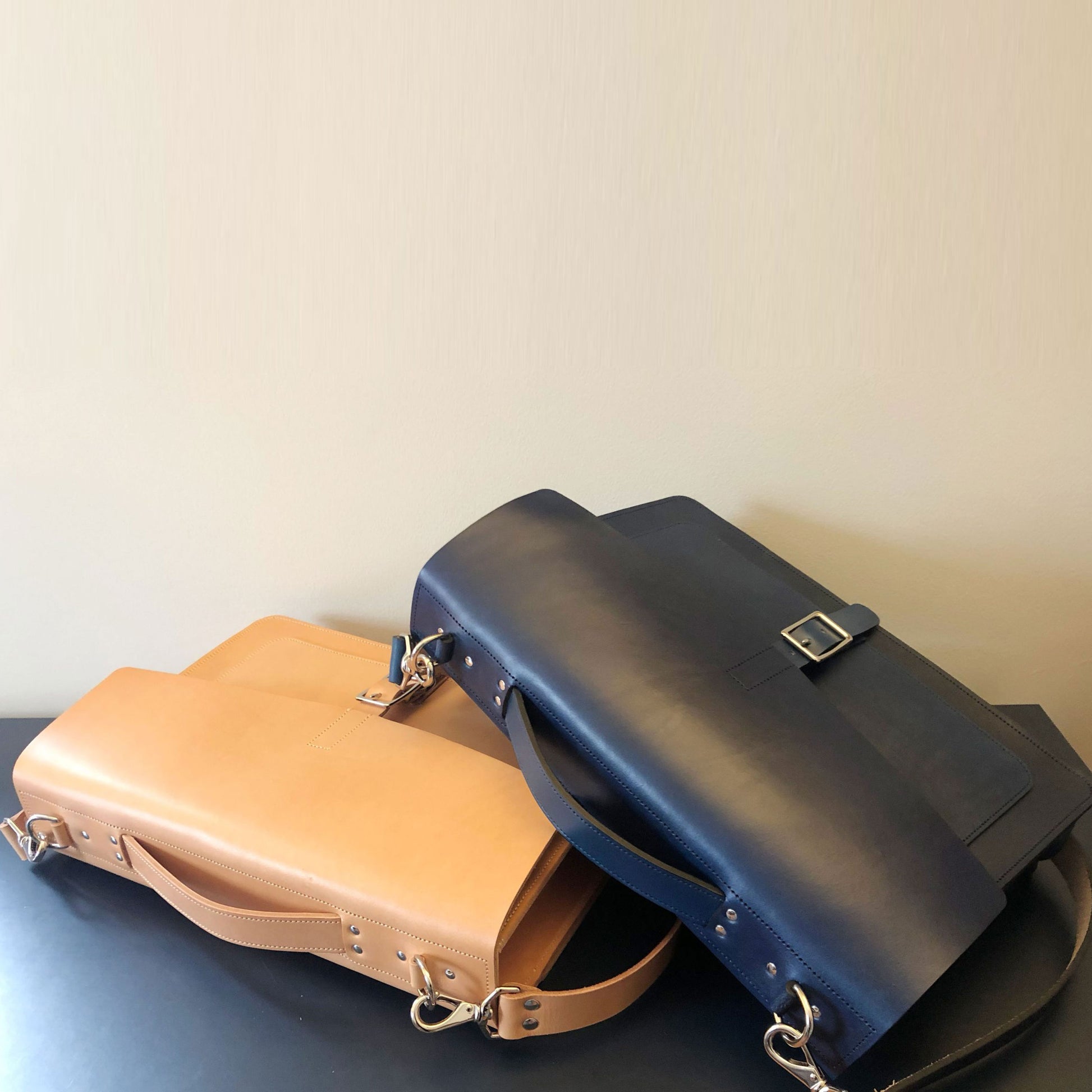 Our slim laptop/messenger bag combines a clean and minimal design with functionality to hold your daily work essentials. Crafted from durable American Vegetable Tanned leather, this bag has undergone drum dyeing and soaking with oils and waxes to achieve a smooth matte finish. The rigid leather and structured construction allow the bag to stand upright on its own, making it perfect for your daily commute and office.