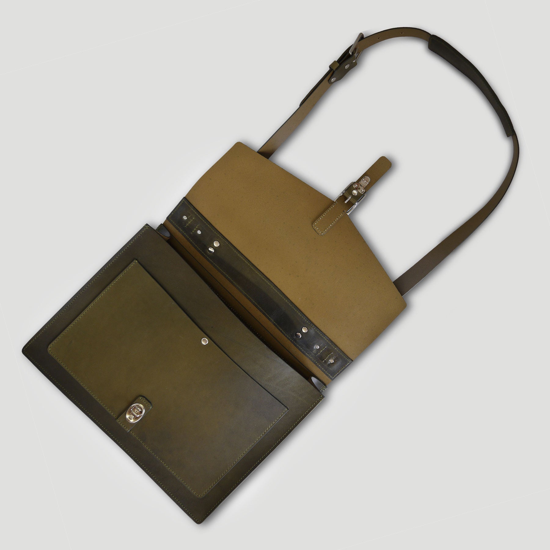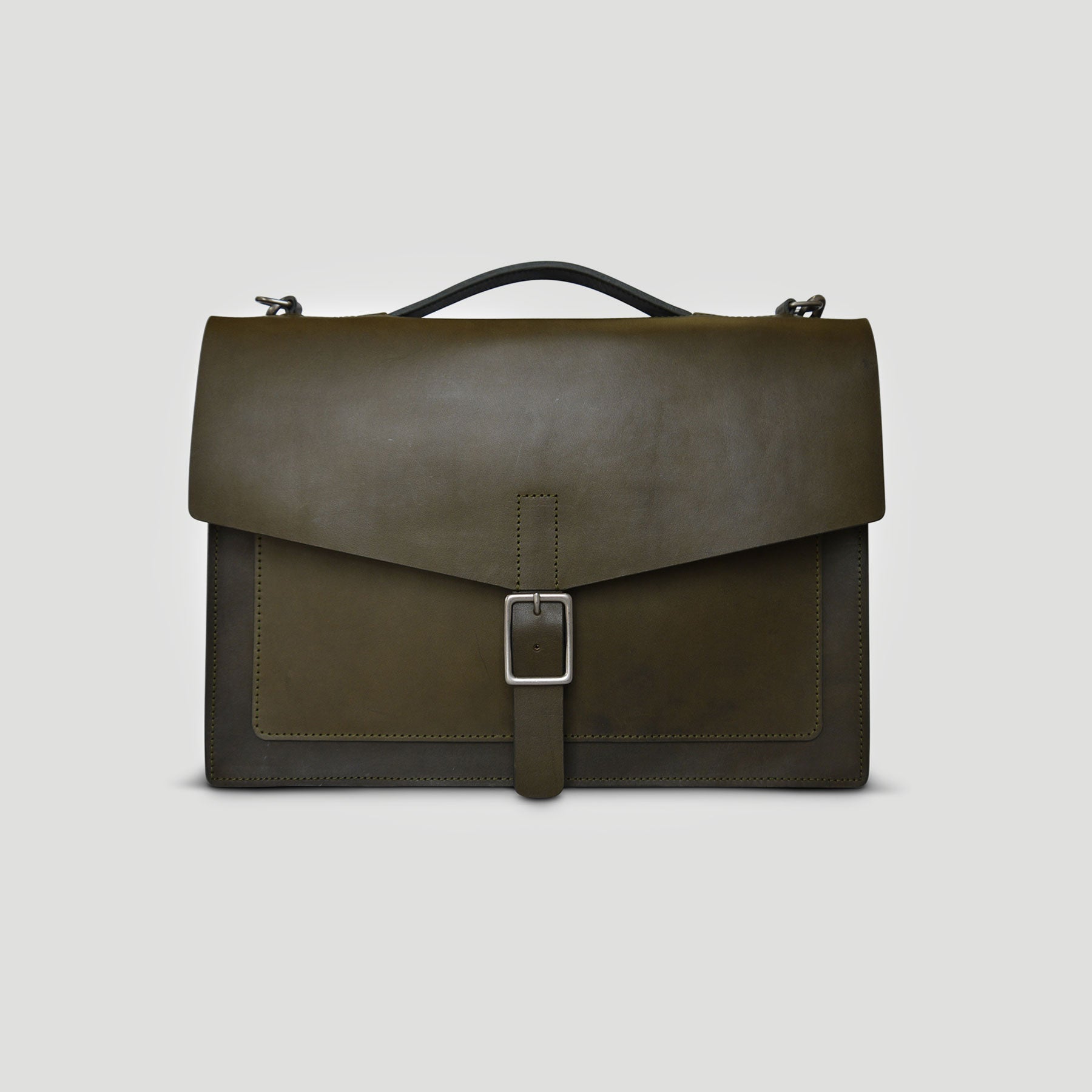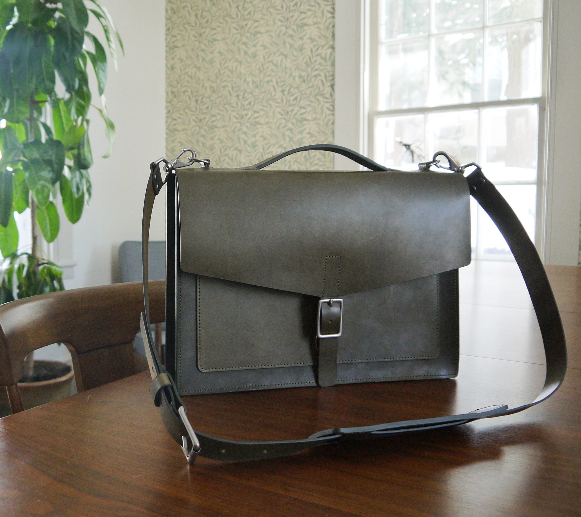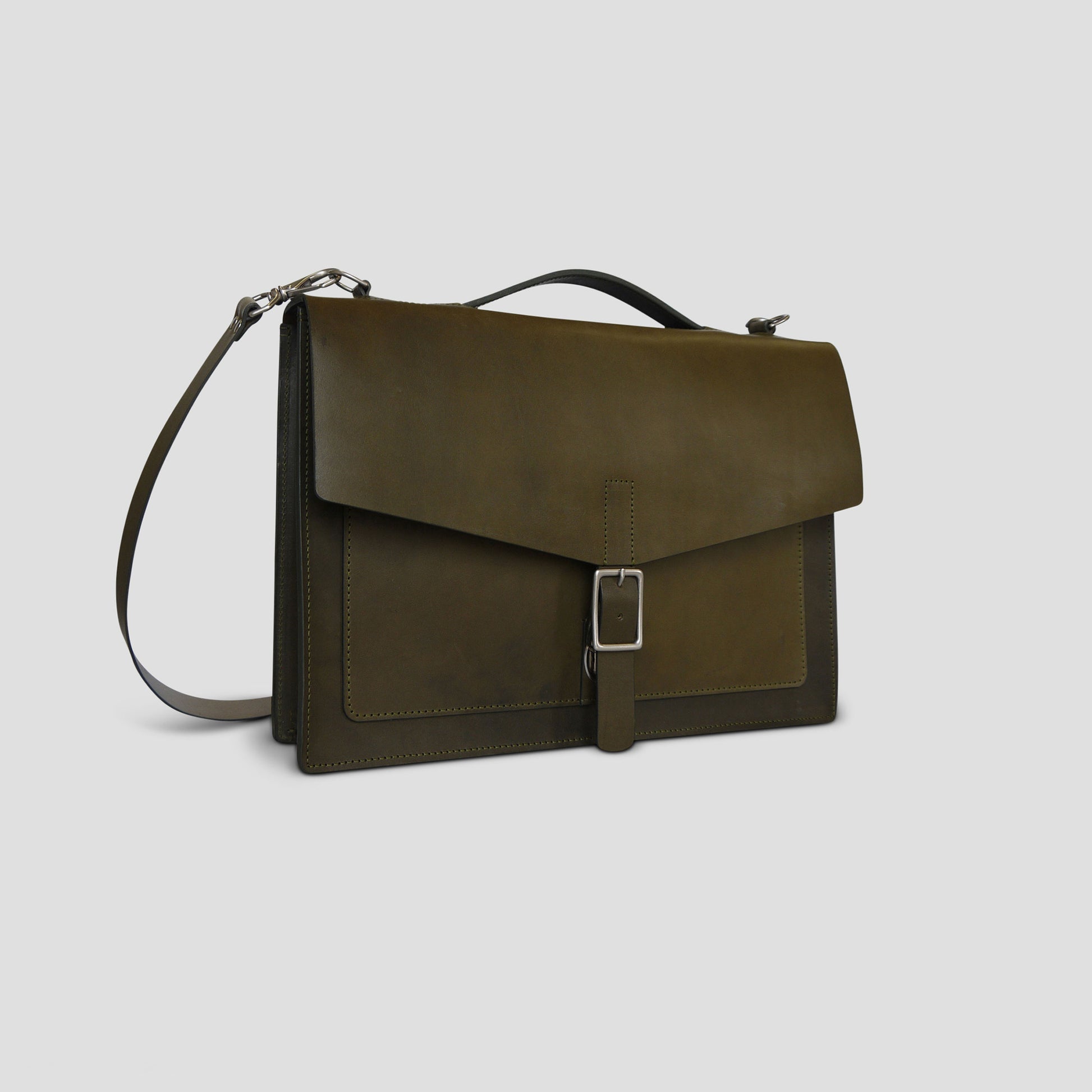 Our slim laptop/messenger bag combines a clean and minimal design with functionality to hold your daily work essentials. Crafted from durable American Vegetable Tanned leather, this bag has undergone drum dyeing and soaking with oils and waxes to achieve a smooth matte finish. The rigid leather and structured construction allow the bag to stand upright on its own, making it perfect for your daily commute and office.