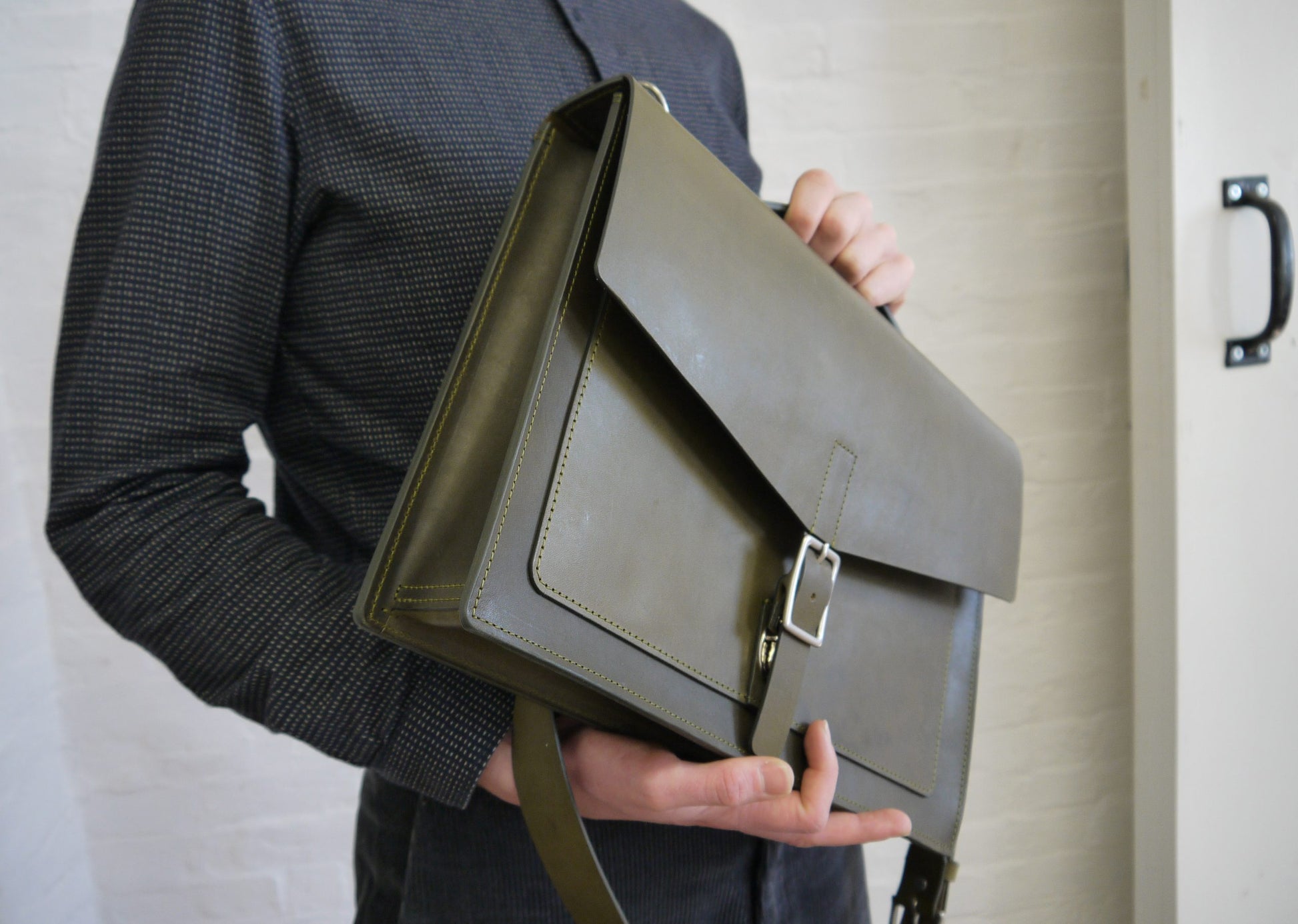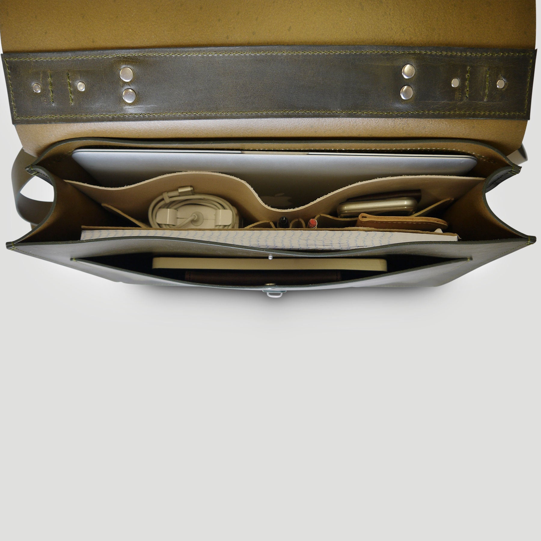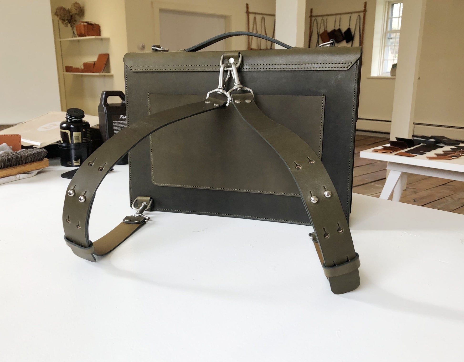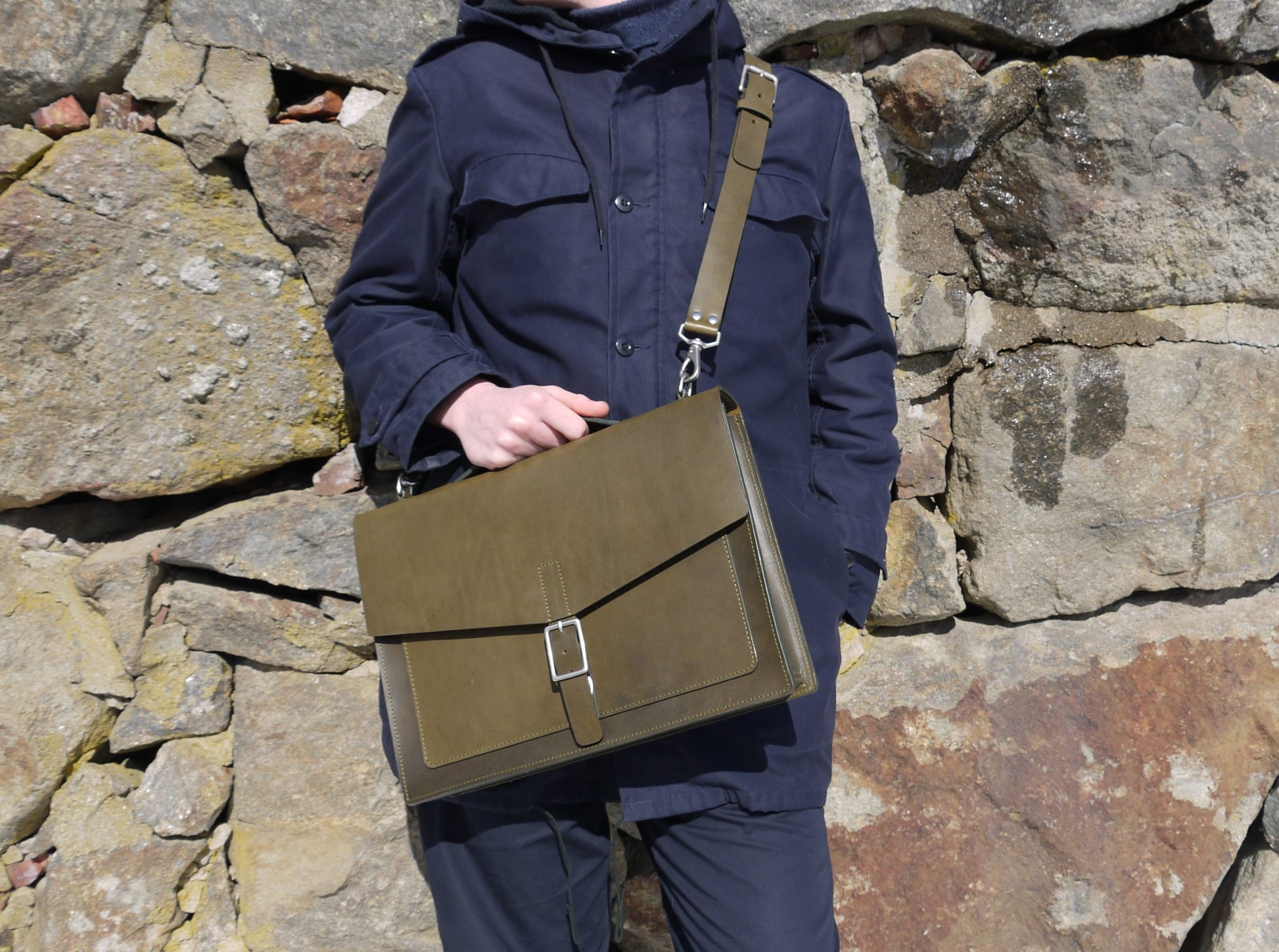 Our slim laptop/messenger bag combines a clean and minimal design with functionality to hold your daily work essentials. Crafted from durable American Vegetable Tanned leather, this bag has undergone drum dyeing and soaking with oils and waxes to achieve a smooth matte finish. The rigid leather and structured construction allow the bag to stand upright on its own, making it perfect for your daily commute and office.