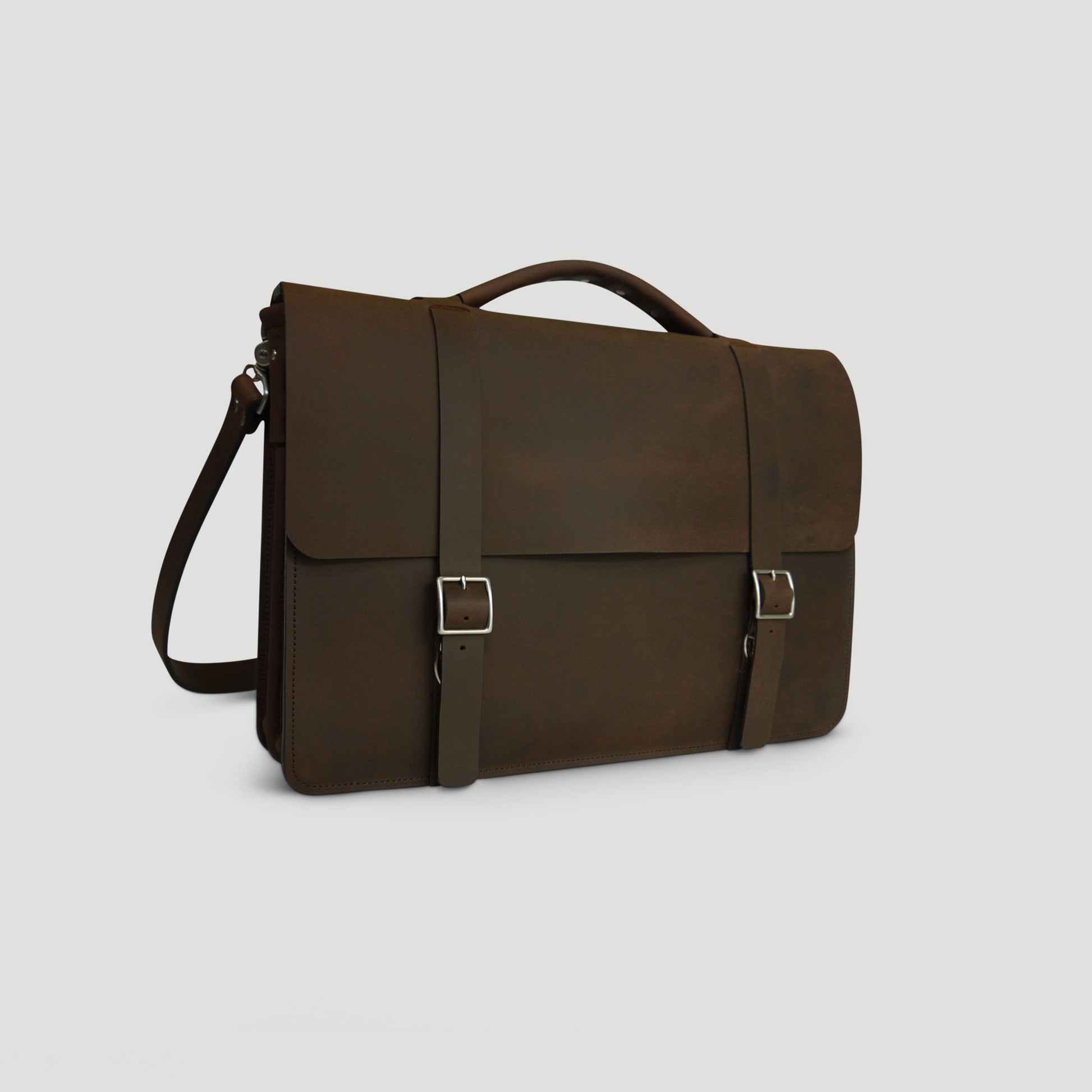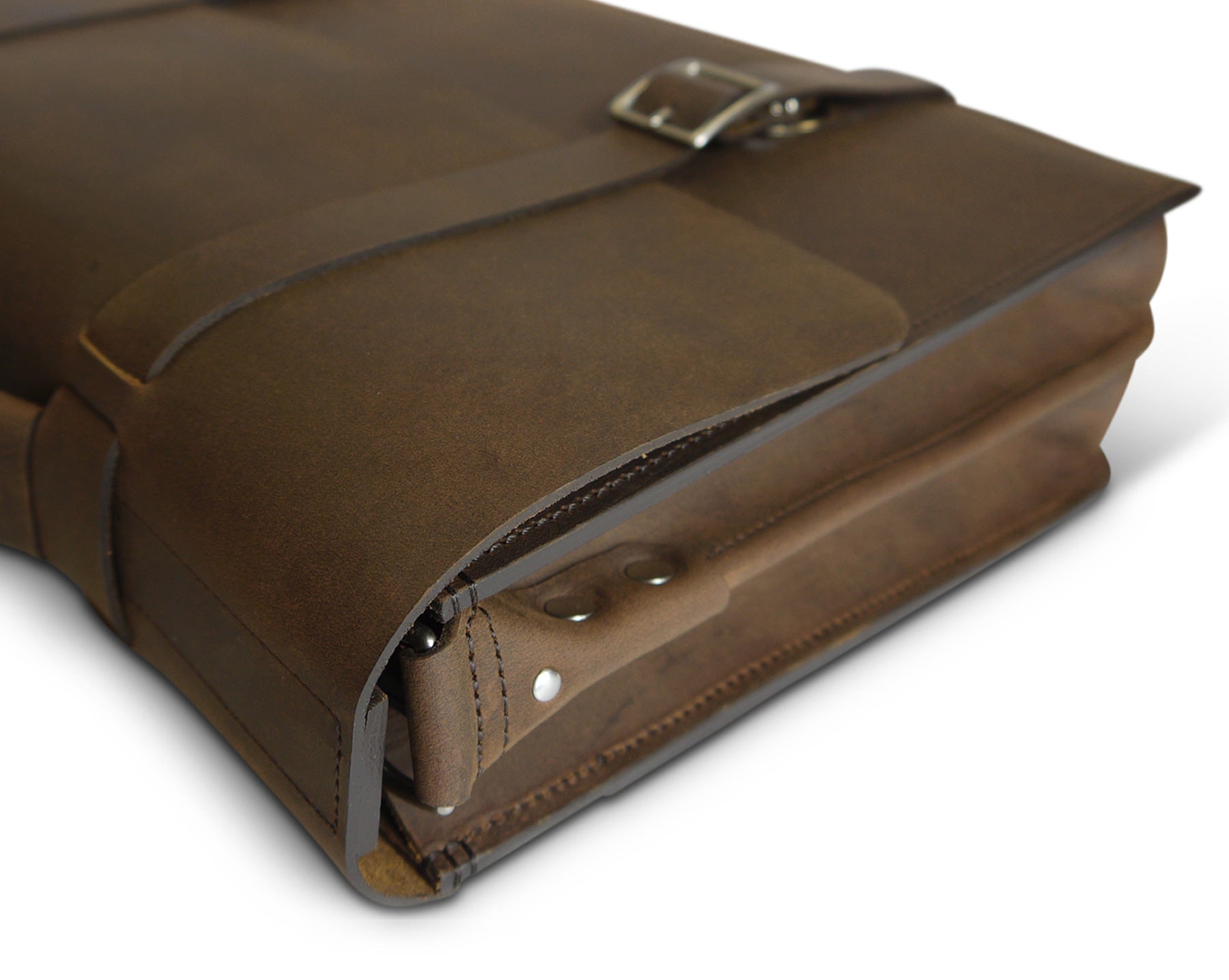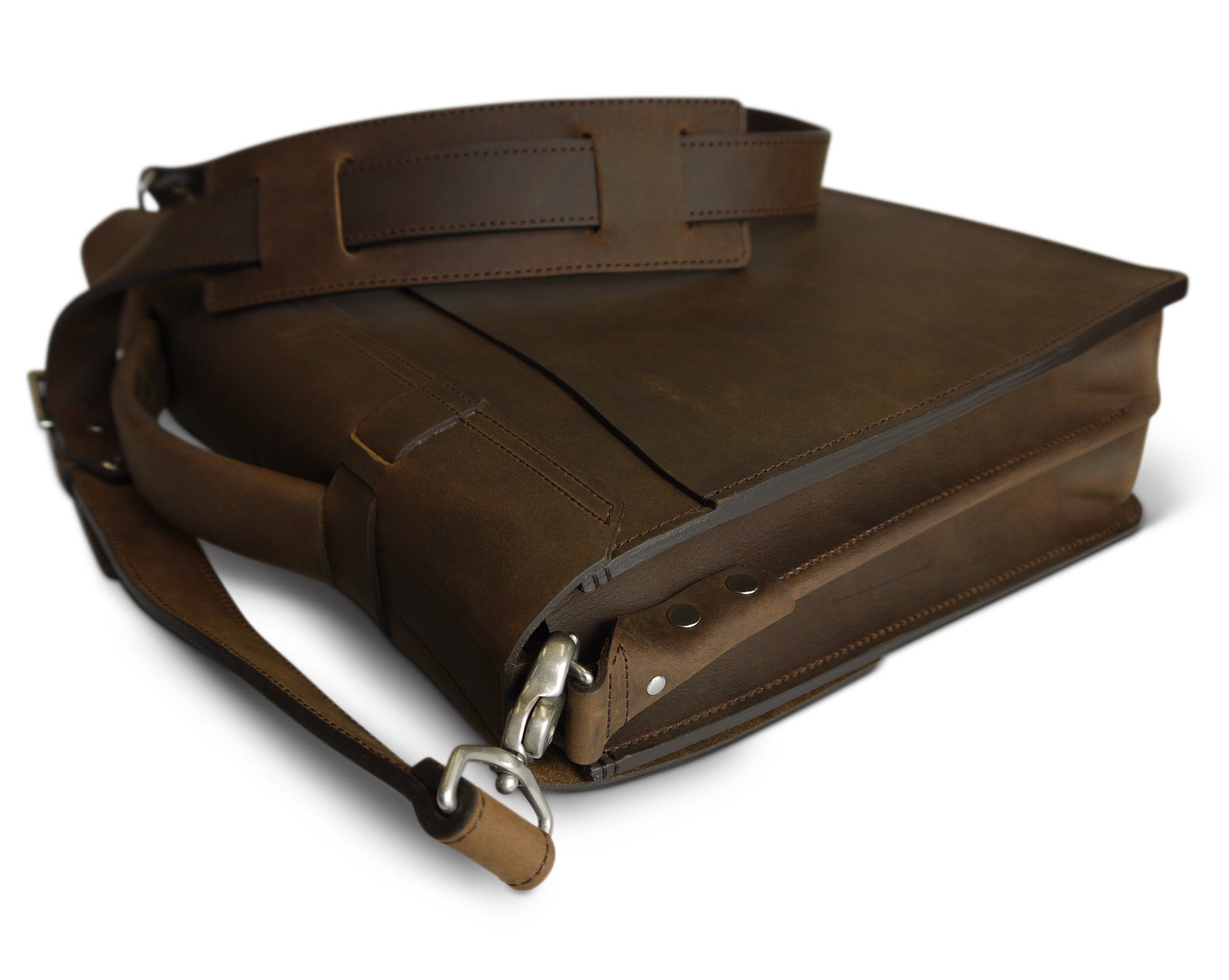 This oil-pull briefcase recreates our Classic Bridle Messenger bag using durable full grain leather. The benefits of pull-up leather are just incredible, and the amount of heavy damage it can sustain is impressive. Our top-of-line messenger is an arrangement of all of our best features: from divided gusset, to faux-buckles, burnished and dyed-edges, and a comfortable handle covering — This bag in bridle leather has for long been our number one selling bag, and is now available in Pull-up leather.