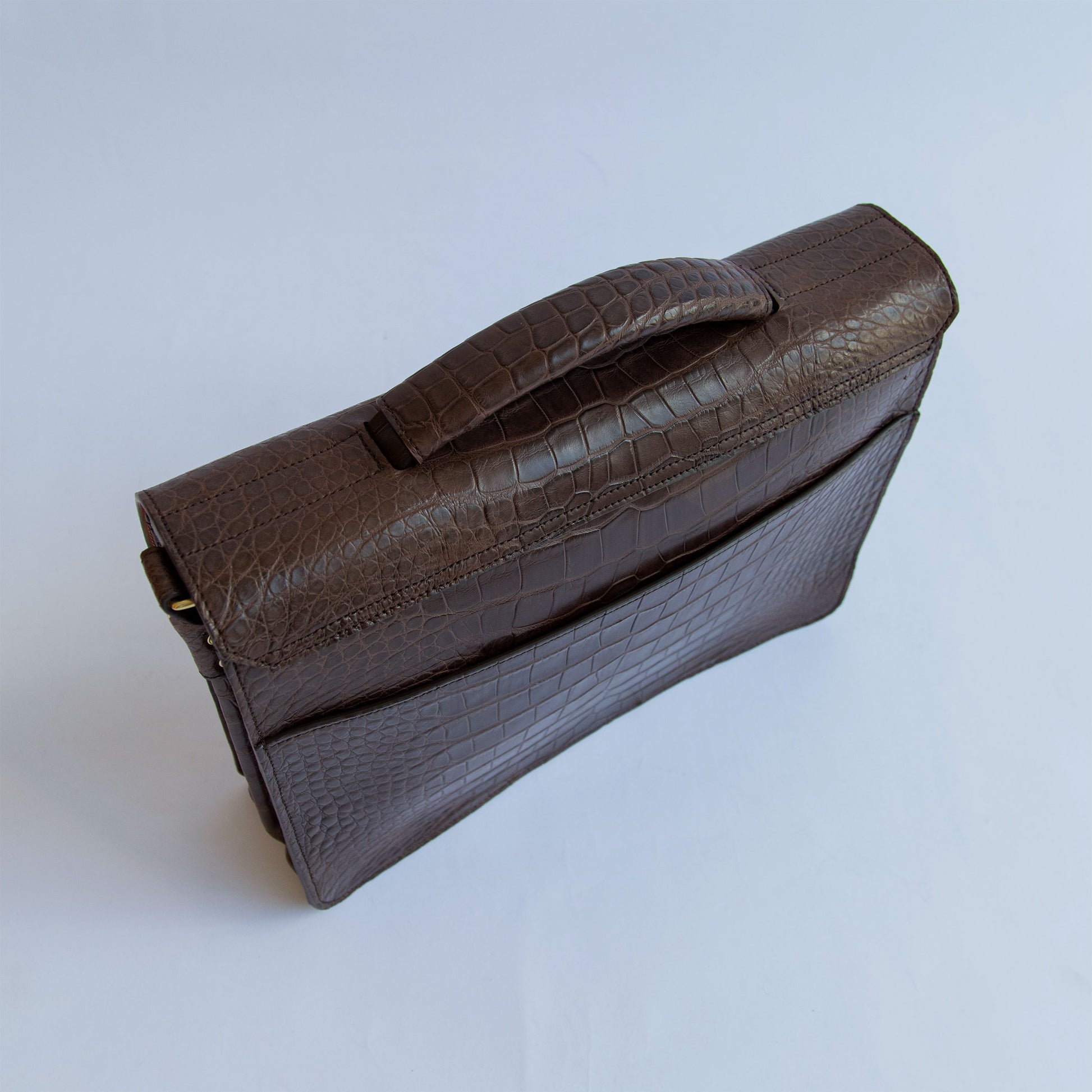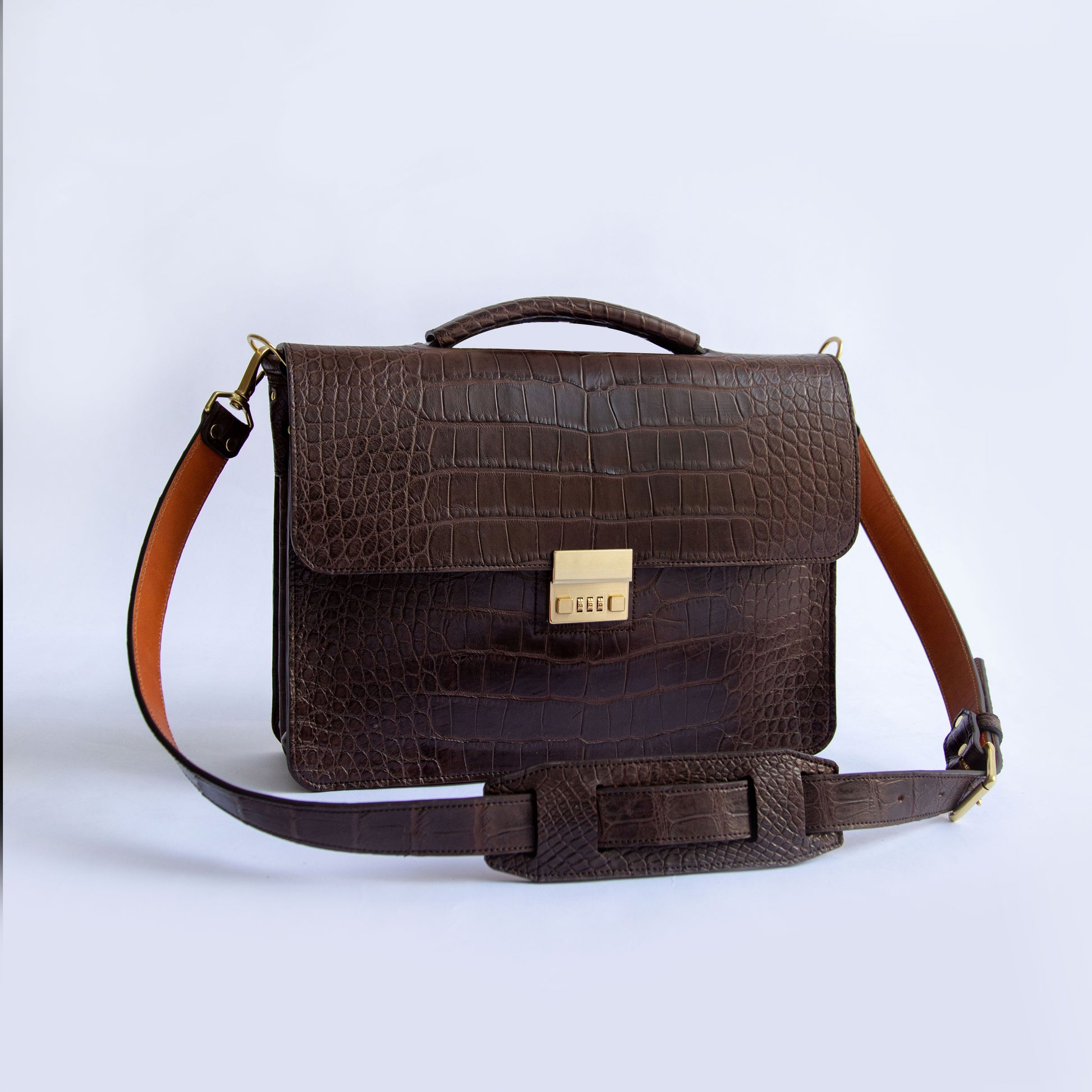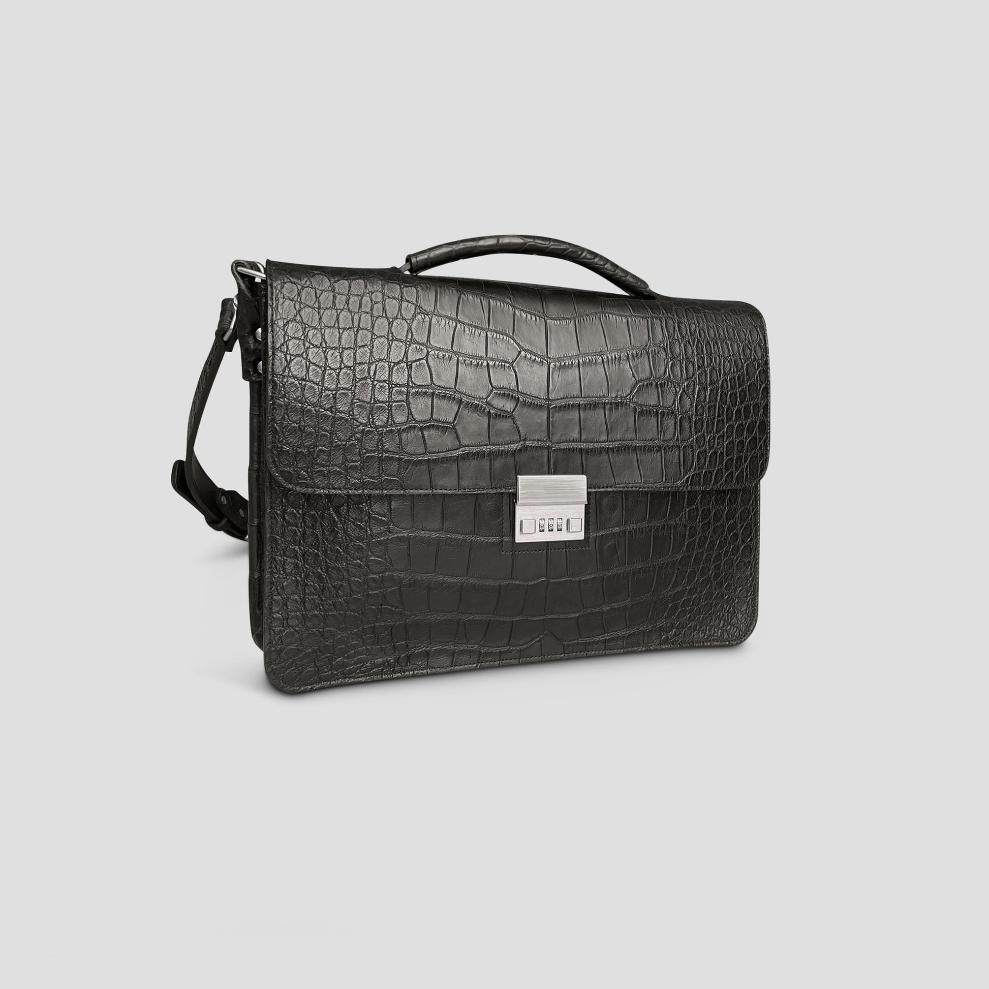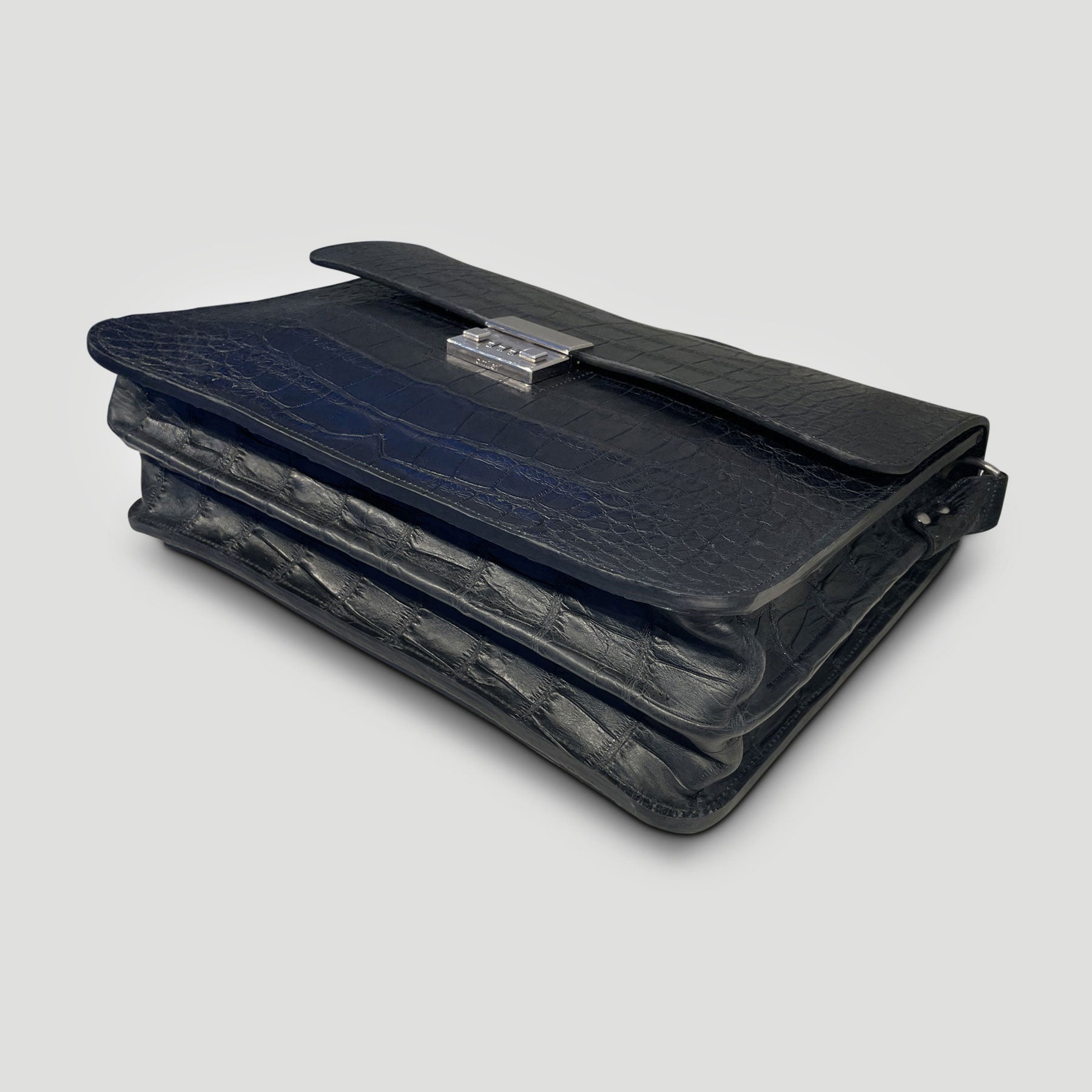 An eye-catching yet timelessly classic briefcase. With clean lines and minimal embellishment, the renowned skin and Amiet lock become the focal point in this design. Crafted from hand-dyed American Alligator, with a thick American English bridle leather lining that ensures its structure and shape will last for years, the briefcase effortlessly stands on its own even when filled.